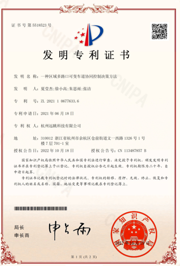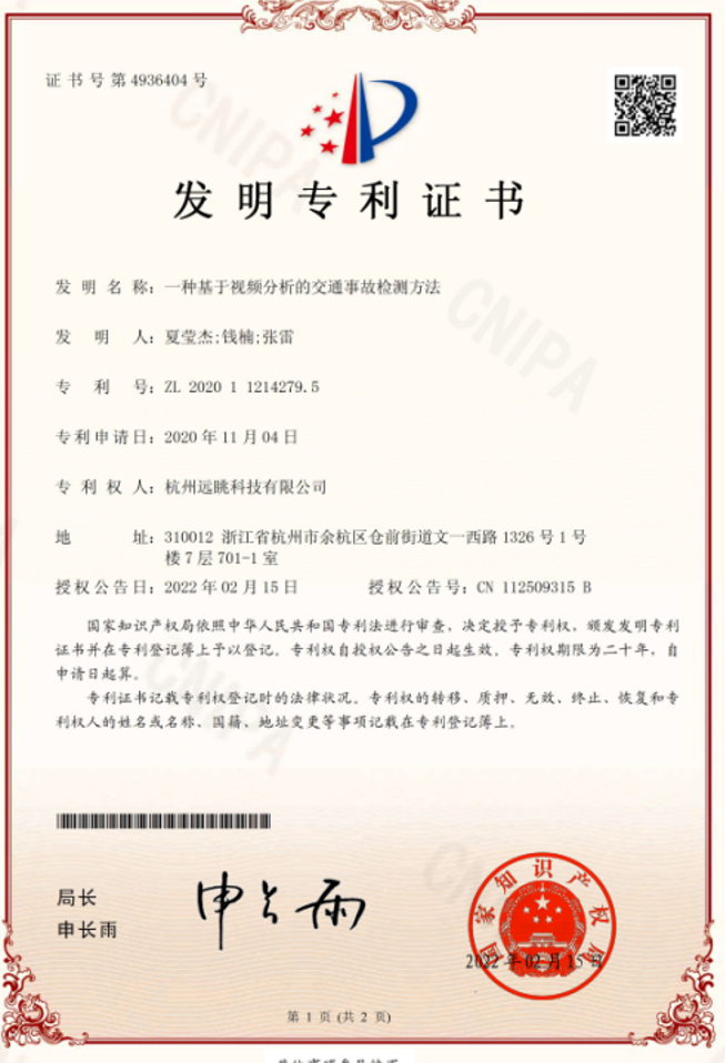 近日,杭州遠(yuǎn)眺科技有限公司申請的“一種區(qū)域多路口可變車道協(xié)同控制決策方法”、“一種基于車輛排隊長度變化率的可變車道轉(zhuǎn)向控制方法”、“一種基于車輛軌跡分析構(gòu)建通勤路徑方法”、“一種基于視頻分析的交通事故檢測方法”4項發(fā)明專利獲得國家知識產(chǎn)權(quán)局授權(quán),累計獲得授權(quán)的發(fā)明專利達(dá)到19項。