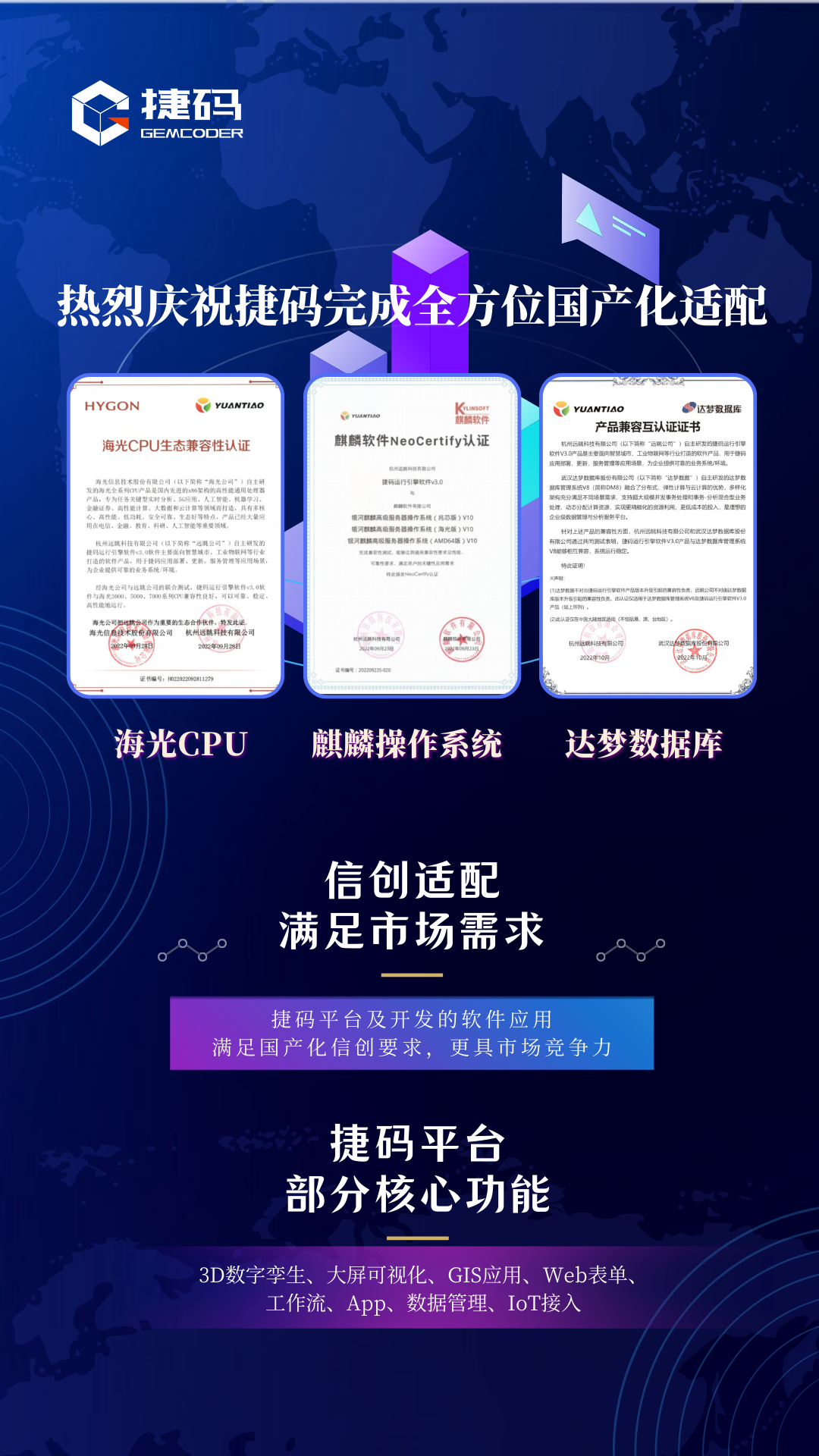 遠(yuǎn)眺捷碼作為全技術(shù)鏈一站式軟件快速開發(fā)平臺(tái),可實(shí)現(xiàn)【全碼開發(fā)】【低碼開發(fā)】【零碼開發(fā)】多種開發(fā)模式,可以方便實(shí)現(xiàn)Web頁(yè)面、大屏可視化、3D數(shù)字孿生、GIS開發(fā)、APP、表單、工作流、邏輯流……等功能的快速開發(fā),能夠幫助企業(yè)高效開發(fā)適合自身業(yè)務(wù)發(fā)展的數(shù)字化系統(tǒng)。 目前遠(yuǎn)眺捷碼已經(jīng)完成了海光CPU、麒麟操作系統(tǒng)、達(dá)夢(mèng)數(shù)據(jù)庫(kù)的國(guó)產(chǎn)化兼容認(rèn)證。此次入選《2022年度浙江省首版次軟件產(chǎn)品應(yīng)用推廣指導(dǎo)目錄入圍名單》,是對(duì)遠(yuǎn)眺捷碼通過自主創(chuàng)新突破關(guān)鍵核心技術(shù)所取得的成果的肯定,也是對(duì)自身的激勵(lì)。 未來(lái),遠(yuǎn)眺捷碼將在數(shù)字化改革浪潮下,堅(jiān)持自主創(chuàng)新理念,推出更多技術(shù)領(lǐng)先、洞悉用戶痛點(diǎn)的產(chǎn)品及解決方案,為數(shù)字化發(fā)展提供更多創(chuàng)新性落地成果。